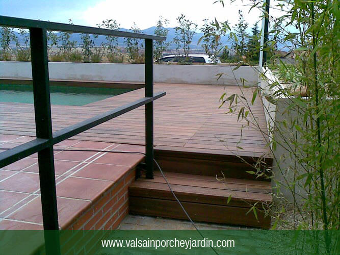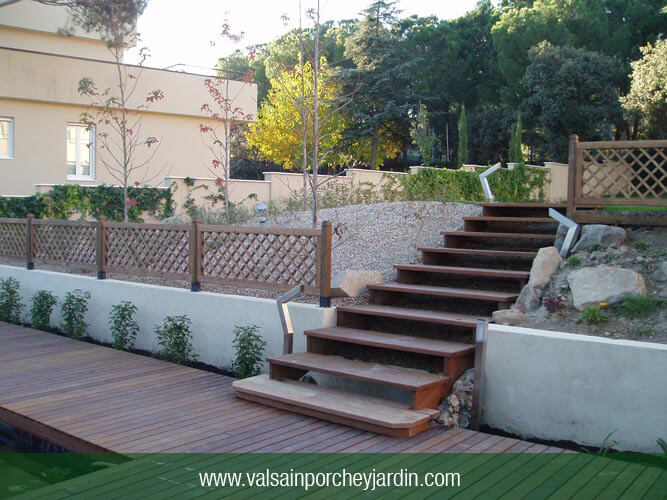 Escalera de acceso con bastidor de pino en autoclave de 7×7 cm fijado a pared y tabla de ipe con remate lateral transversal