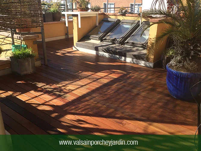 Suelo de ipé de 95×22 mm sujeto mediante grapas y tornillería de acero inoxidable